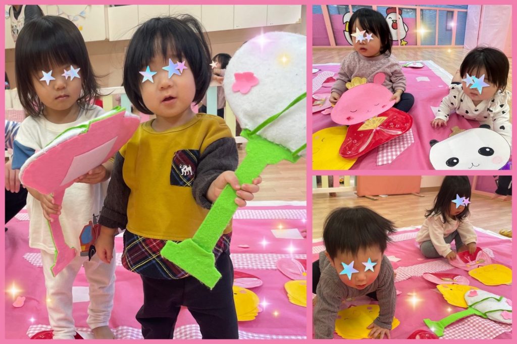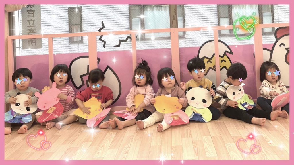 ベビールームのクラス名にちなんだ 動物さんの人形を手に