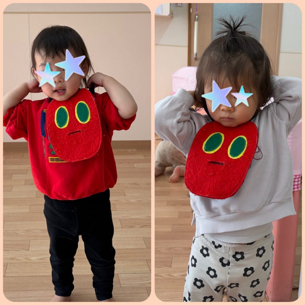「センセー、見てー」とあおむしの顔を胸に当ててエプロンの様に楽しんだり。