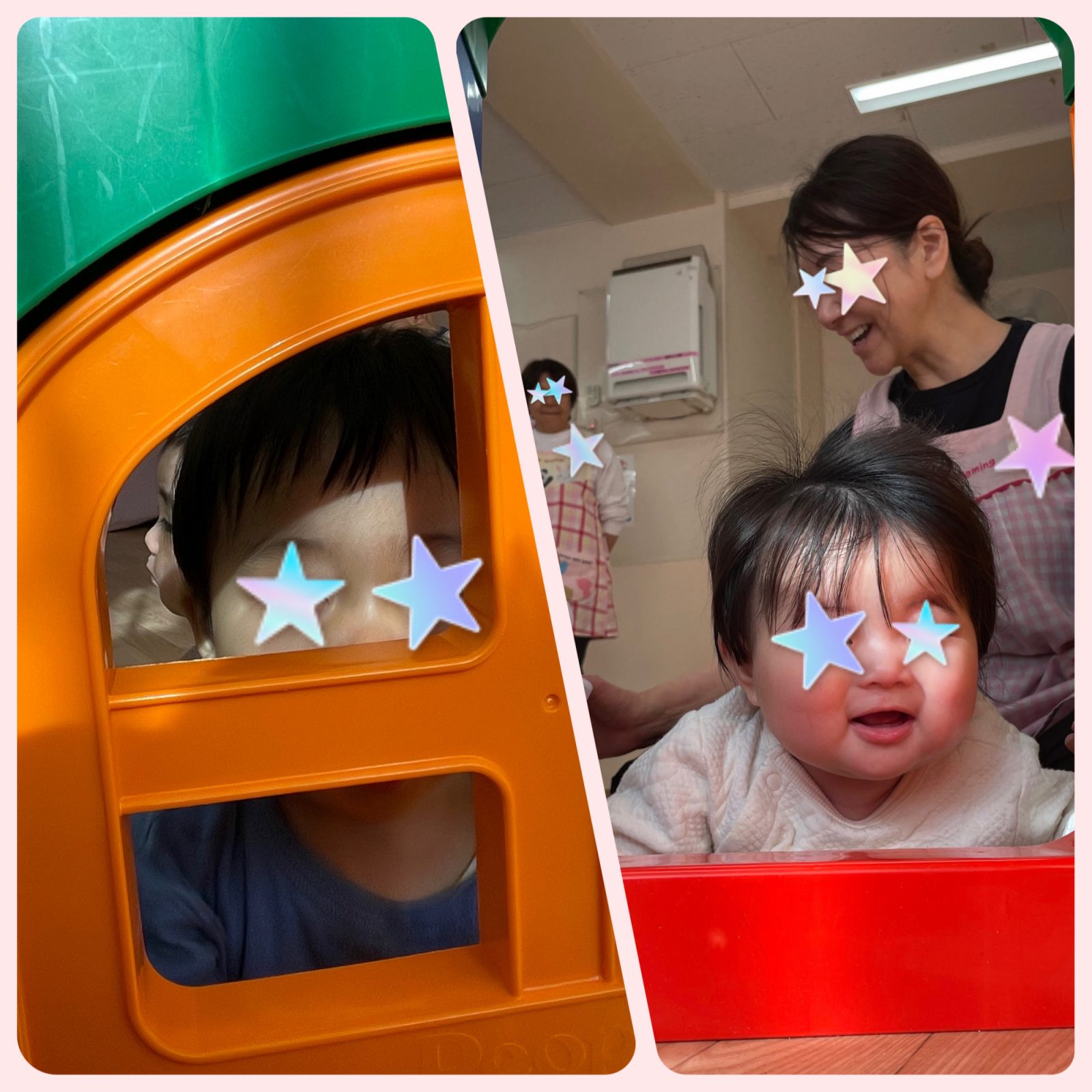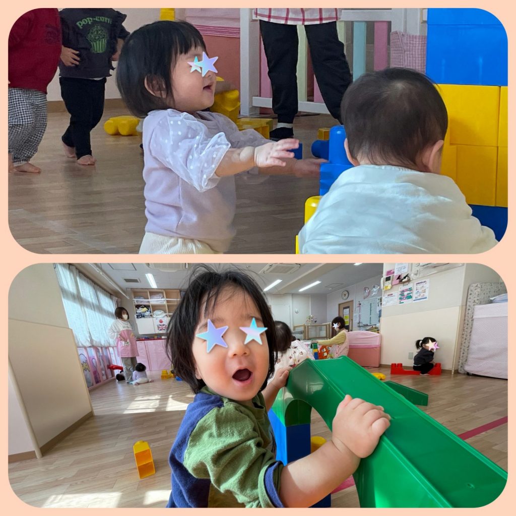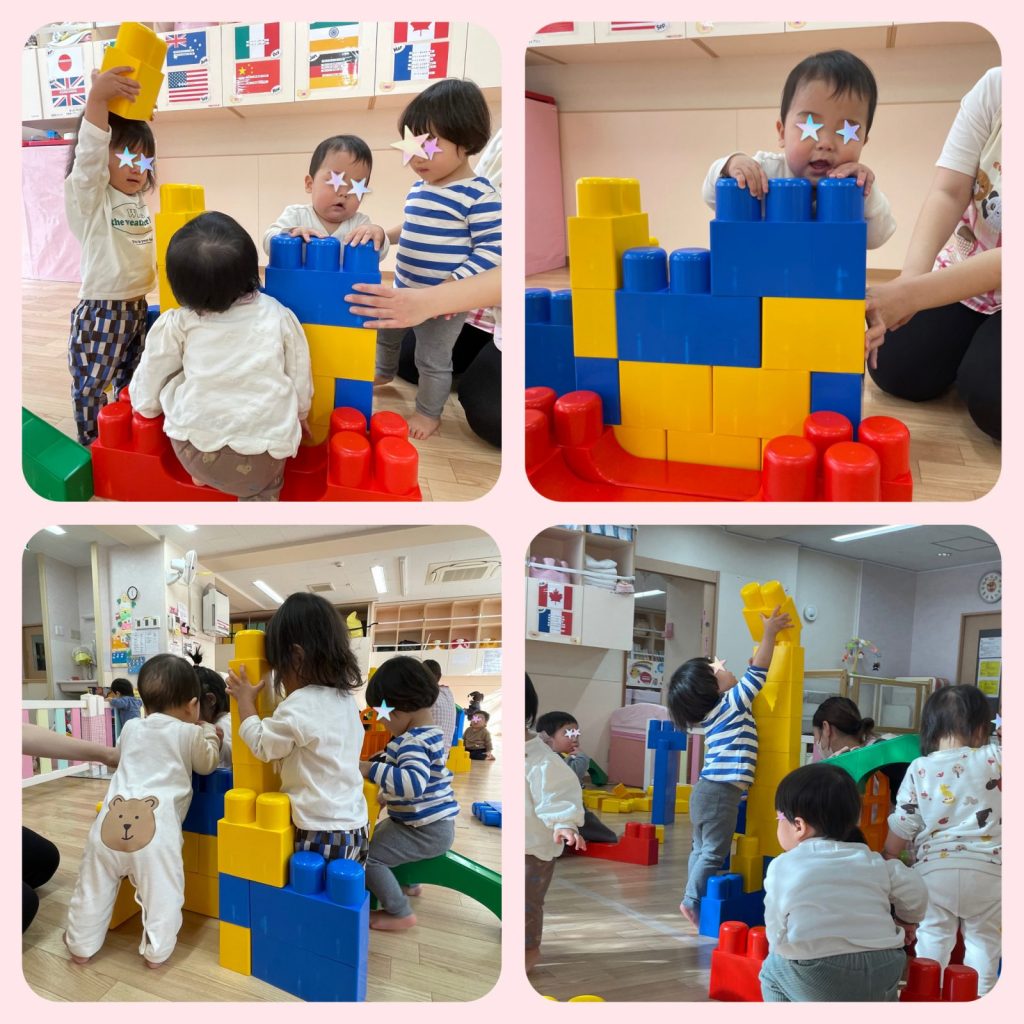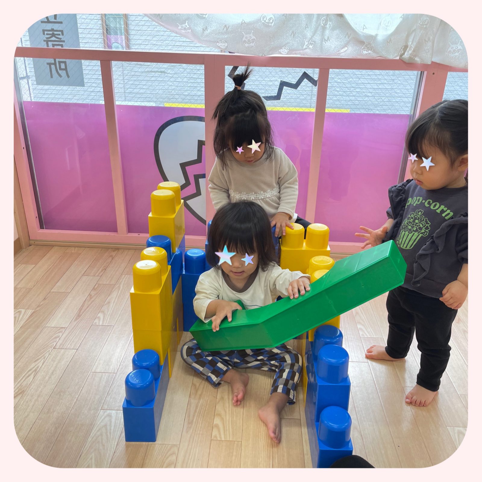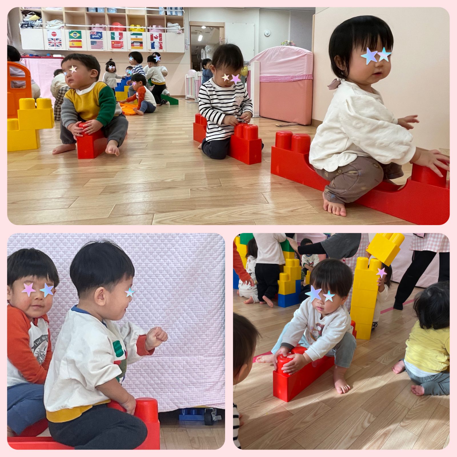 お家を作ろう。 2026年1月21日 こあら組 大型ブロックを、家作りの土台のように配置していくと….。 意図がわかったかのように、手に手にブロックを持ってきては一緒に積み上げます。 「よいしょ、よいしょ」可愛い掛け声と共に、高い所も、こうすると届くよ、と背伸びをしています。 「ぼくのお家はここ。」と中に座って満足そう。 「お出掛けするよ。」 マイカーに乗って、レッツゴー。 お家をお邪魔する時は? 「トントントン」のノックも忘れないでね。 ドアの向こうから覗いているのはだ〜れだ。