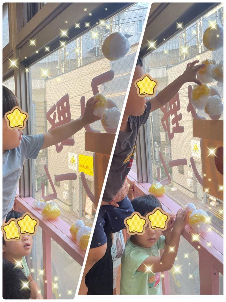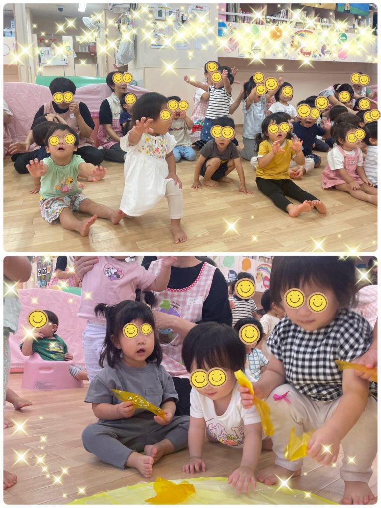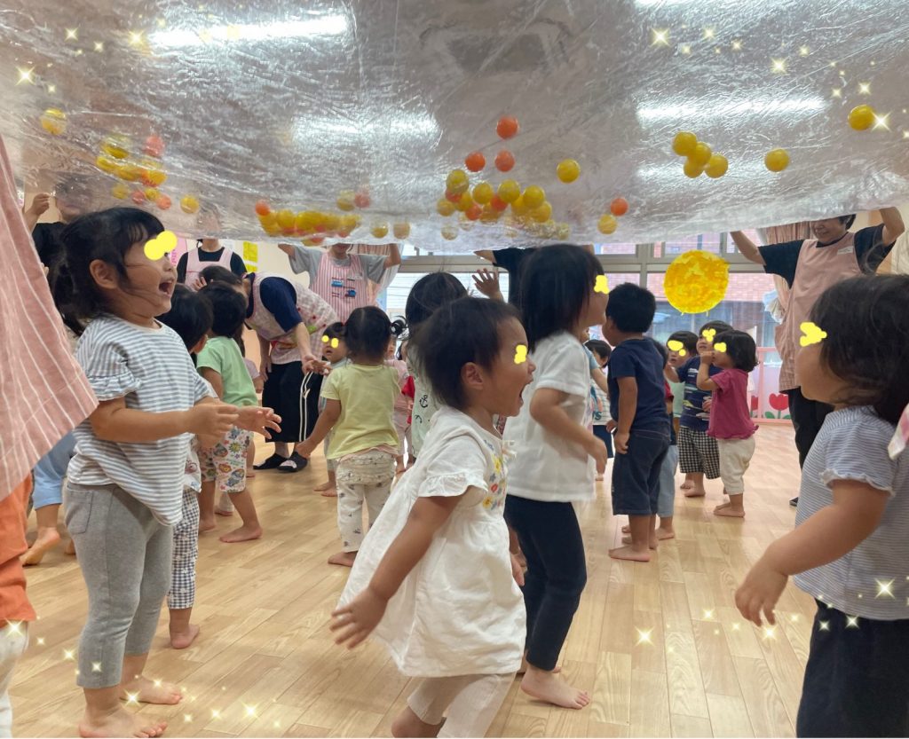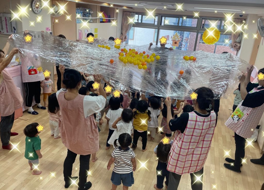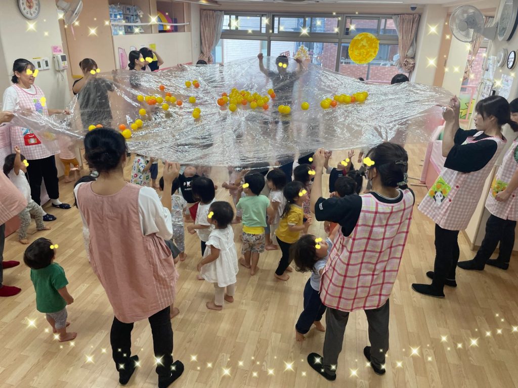 透明なパラバルーンにお月様カラーのボールを乗せて、お月見ごっこのスタートです