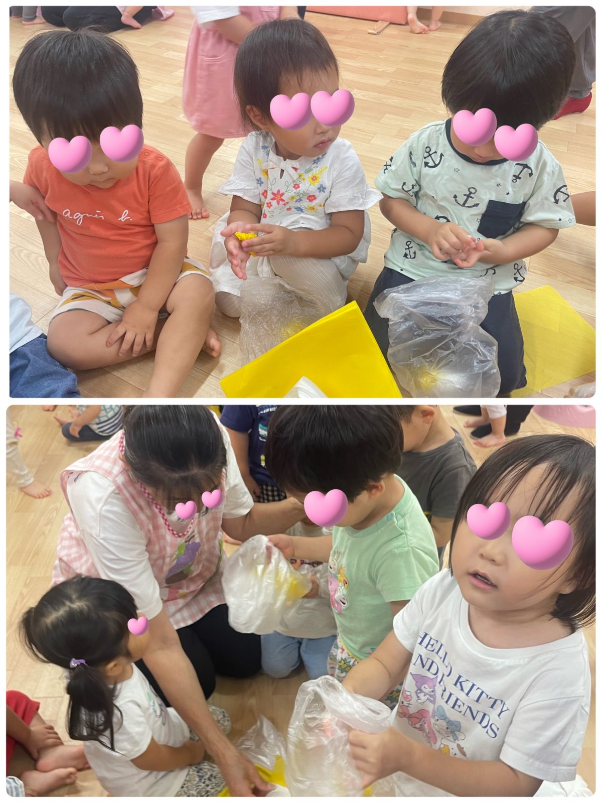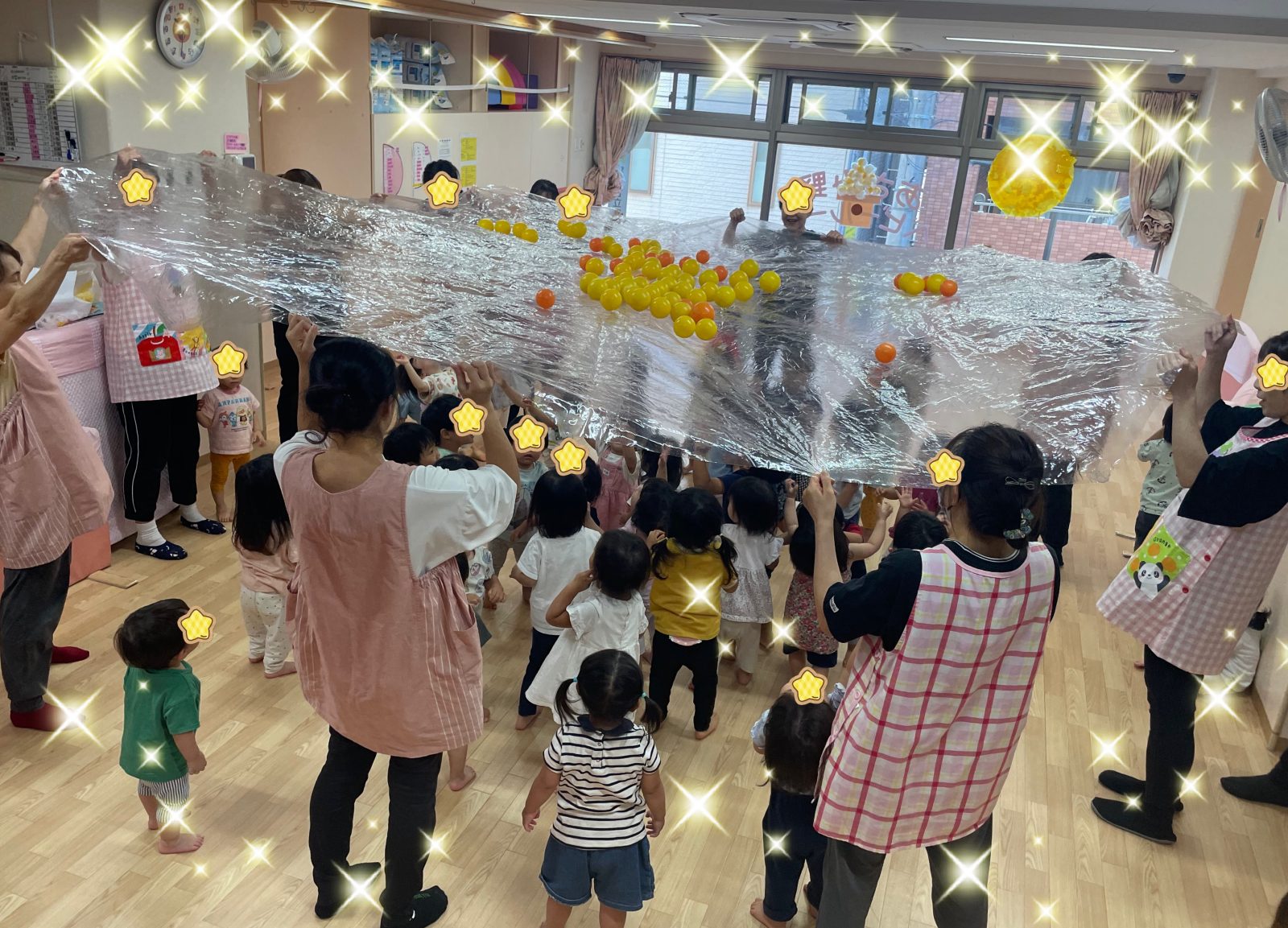 透明なパラバルーンにお月様カラーのボールを乗せて、お月見ごっこのスタートです