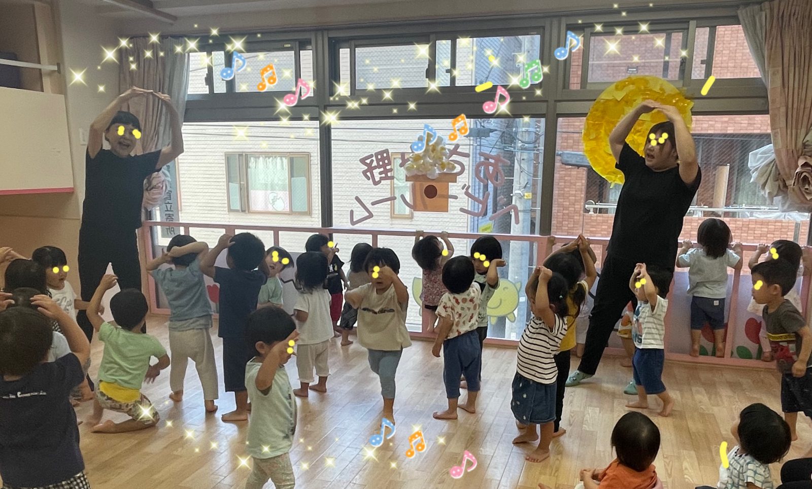 大きなお月様とお団子が優しく皆を見守っています。一足早い中秋の名月を楽しみました🌕