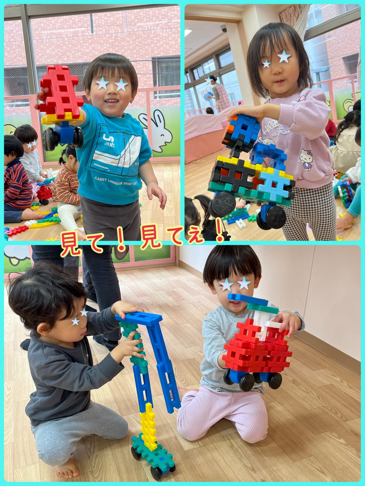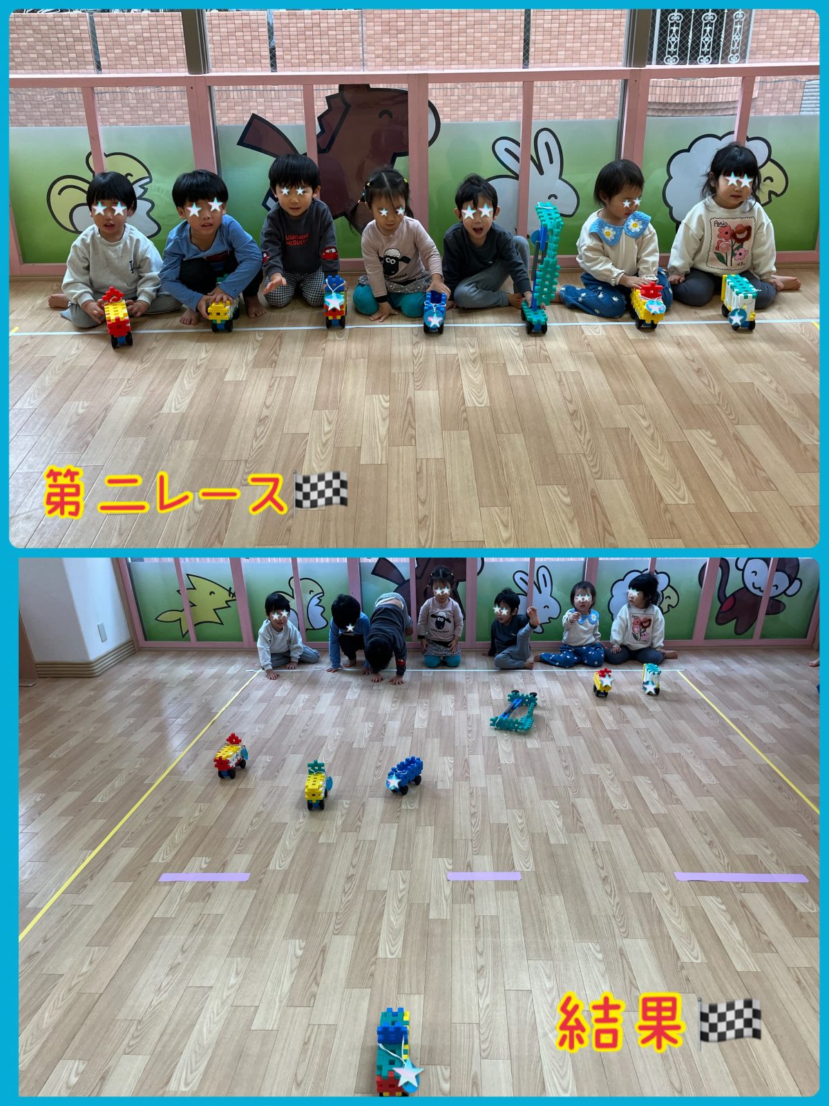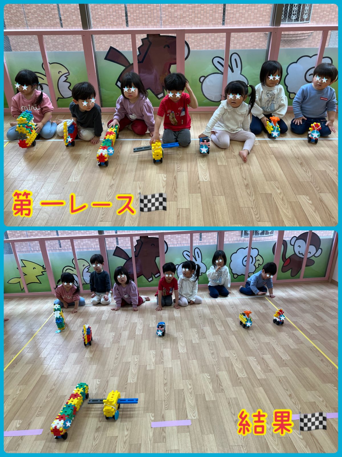 レーシング対決🏎️💨 2026年1月29日 ぱんだ組 発想力・想像力が豊かに!! ※職員の手助けは不要 自分達で器用に作りあげたのは、、 ひとり一台の愛車♡ それぞれ形や大きさにこだわりながら 作ったのは〜 ハシゴを再現し消防車🚒 長くしてクレーン車🏗️ プリンセスが乗るお馬さん🎠 そこで第1回ぱんだ組🐼レーシング対決開催🏁 ビューンと走る車もあれば 早々と転倒してしまう車も💦 どんな結果であっても 嬉しそうな表情でした♪♪ 仕上がり具合も遊び方にも 成長を感じられました☆ 第2回レーシング対決はいつ開催かな〜??