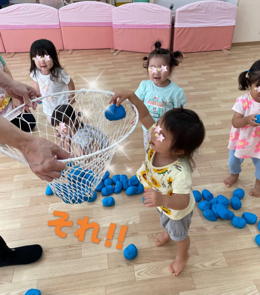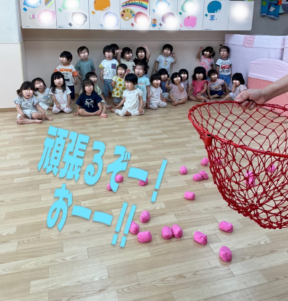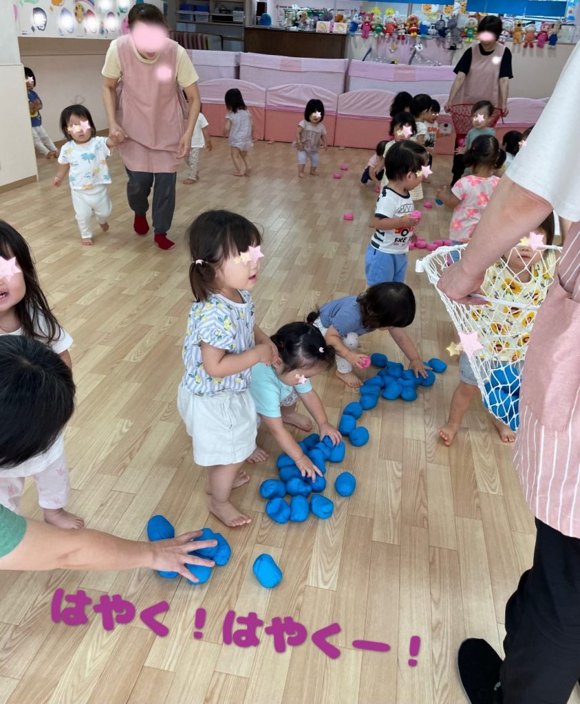 開始の笛がなると、一斉に玉を取りに行くチームうさぎ組‼️