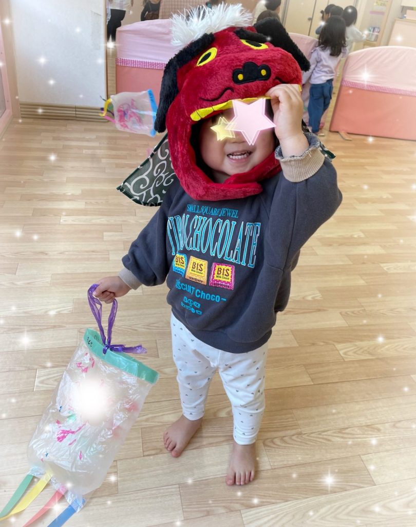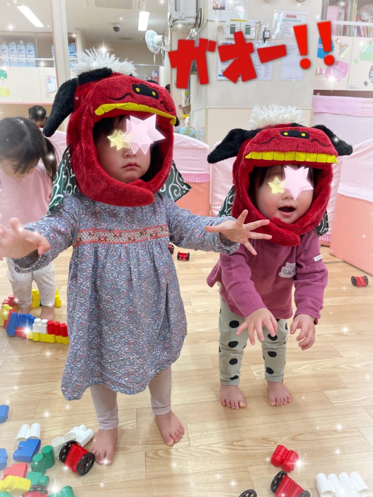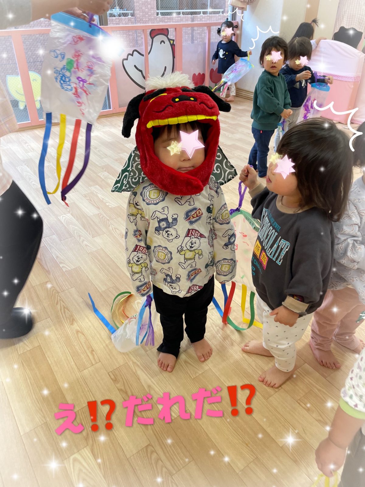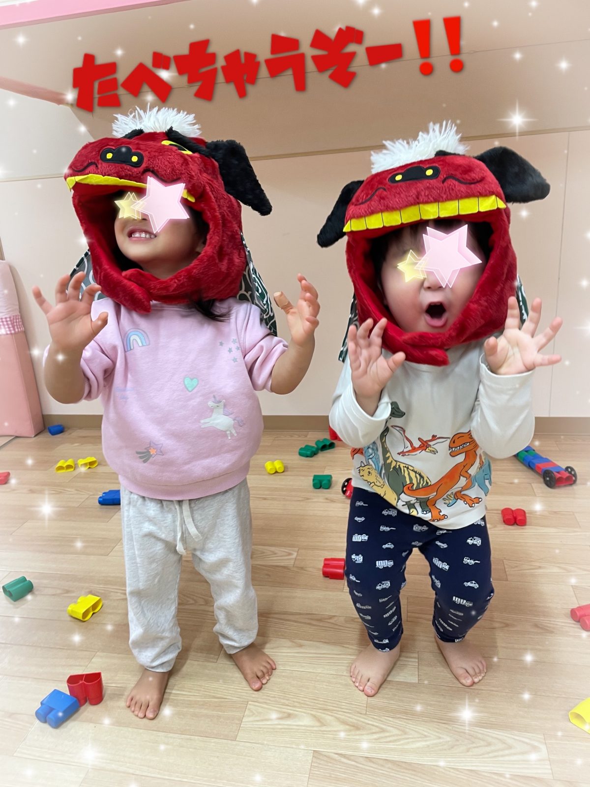 という事で、ベビールームではお正月に向けて獅子舞の被り物が登場✨