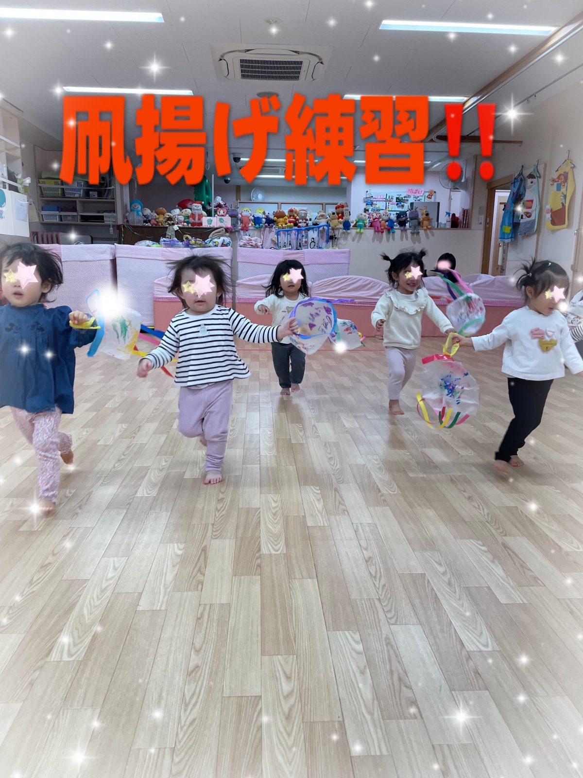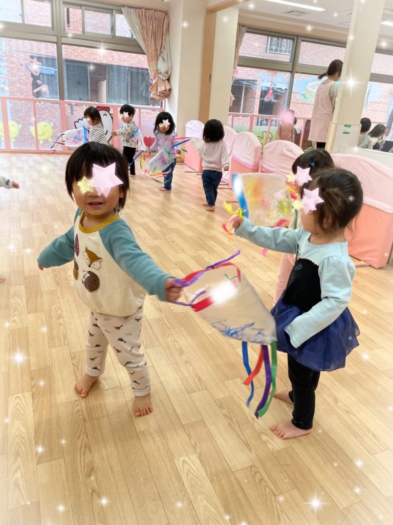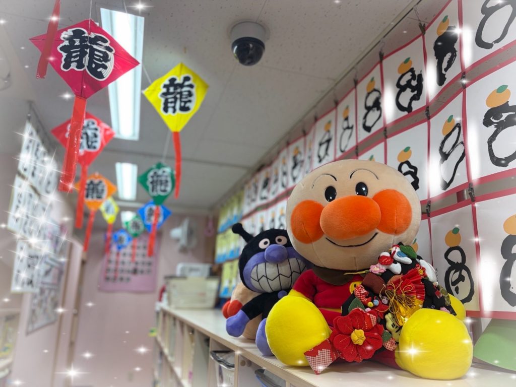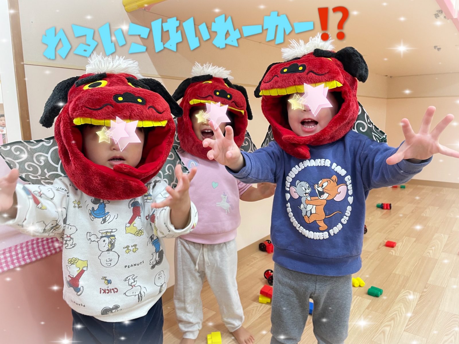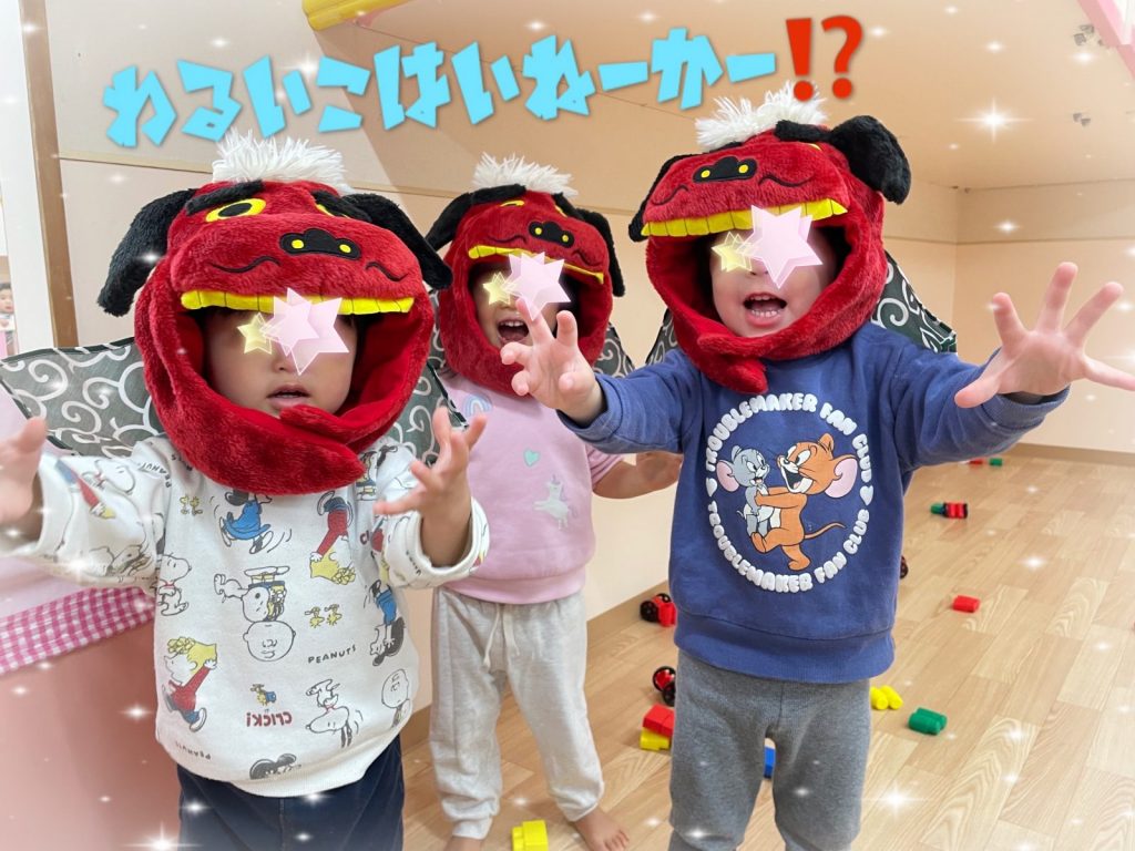 という事で、ベビールームではお正月に向けて獅子舞の被り物が登場✨